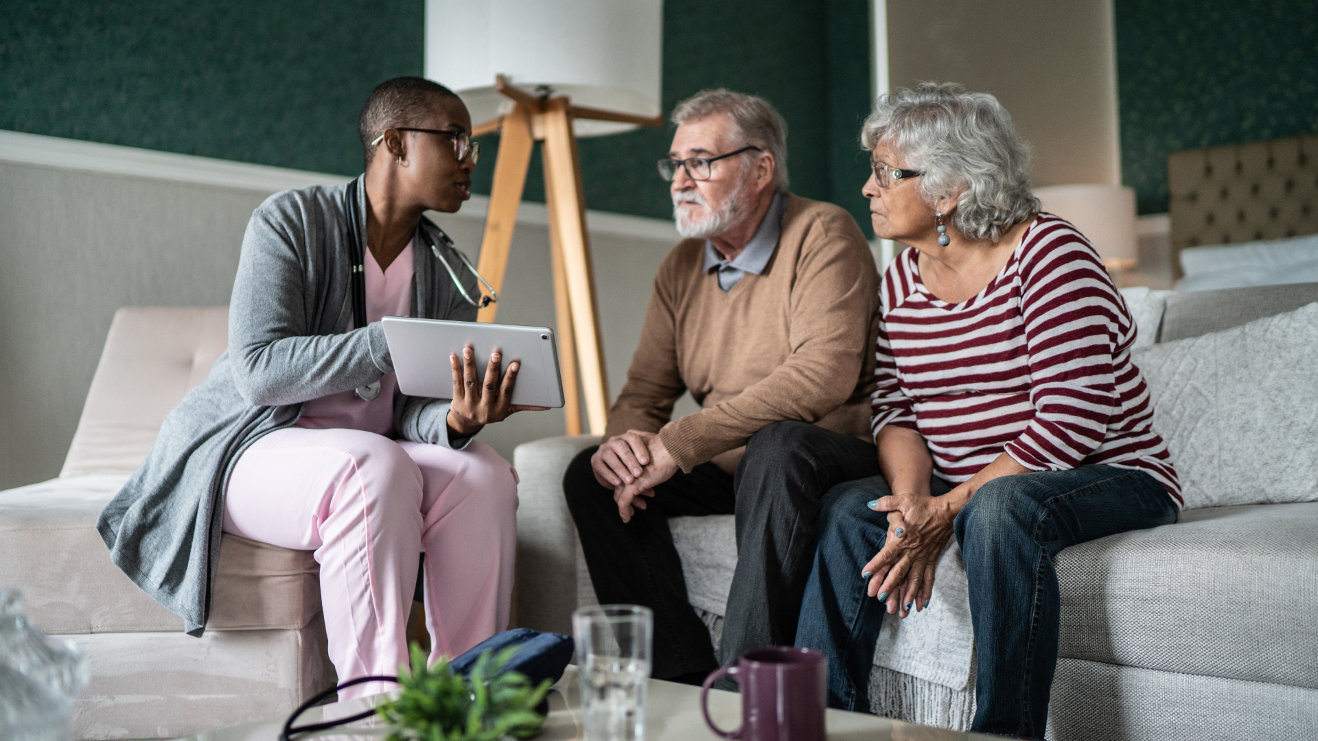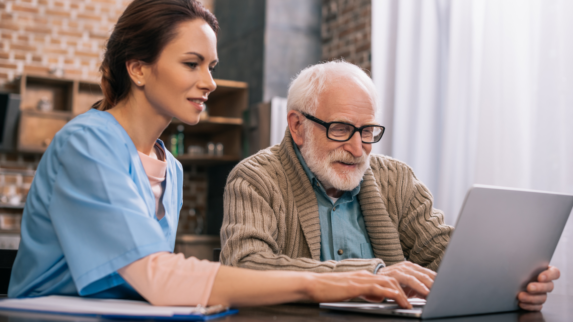 Healthcare provider helping elderly man with glass use a patient portal on a laptop