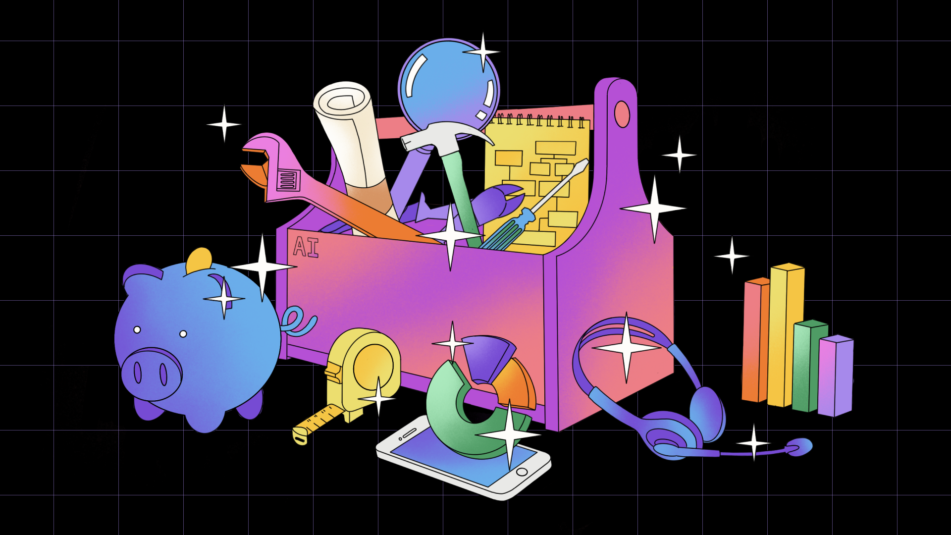 Illustration of a toolbox with AI on it and tools, devices, journey maps, customer service headphones, and data charts
