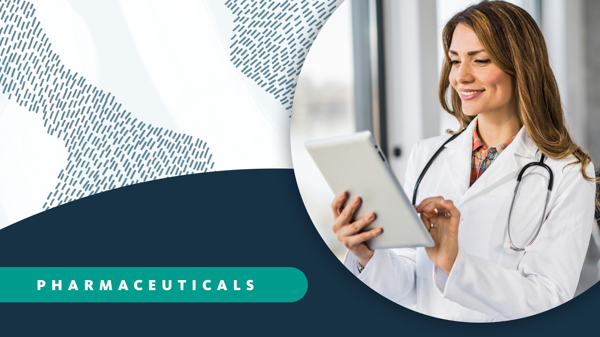 Healthcare professional looking at a tablet with the label pharmaceuticals